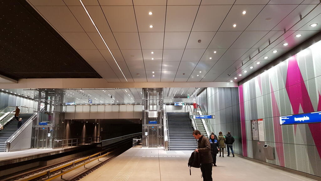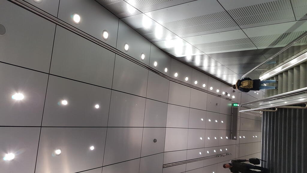 The North-South metro's ceiling in Amsterdam, has been clad with our X-Wall SMF Natural product. The material was micro-perforated before anodising.