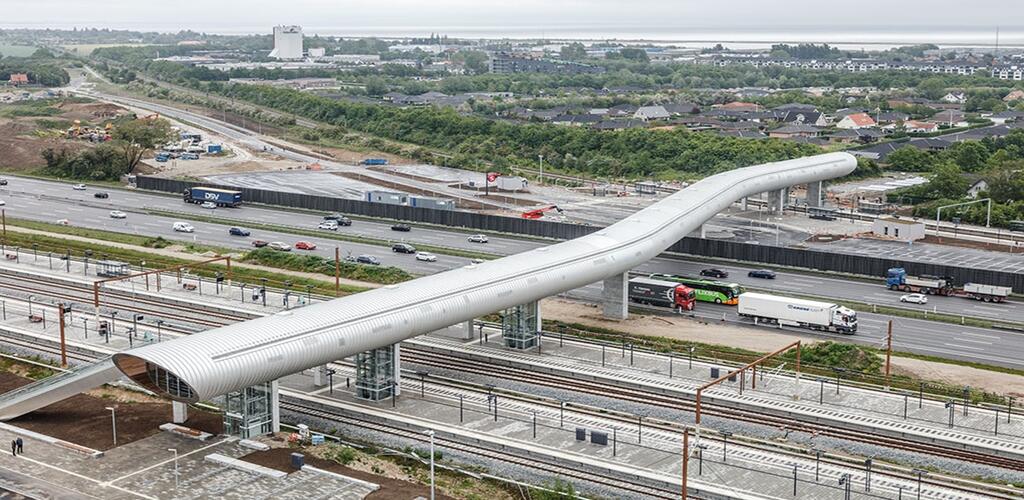 Køge Nord station is a transfer station between the Copenhagen - Køge railway line and the Copenhagen - Ringsted railway line. The station, together with the railway line Copenhagen - Ringsted, was opened on 31 May 2019 by Crown Prince Frederik. The next day the station was included in the timetable. The station is located on both sides of the motorway just north of the junction towards Falster and Jutland respectively. The platforms are connected to each other by a footbridge over the tracks and the motorway.