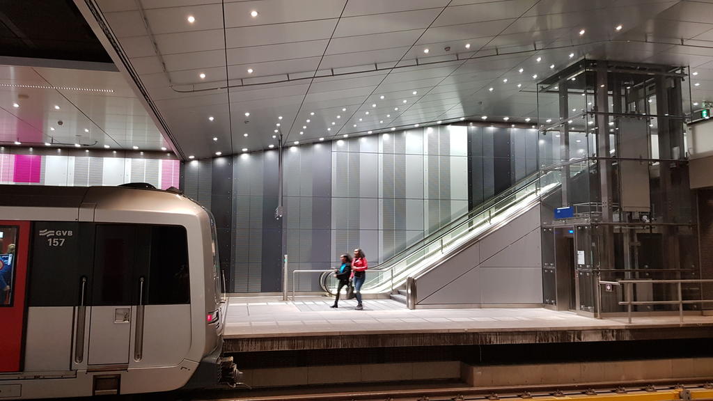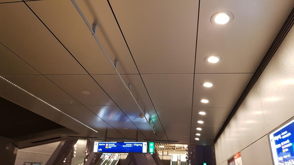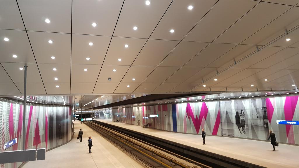 The North-South metro's ceiling in Amsterdam, has been clad with our X-Wall SMF Natural product. The material was micro-perforated before anodising.